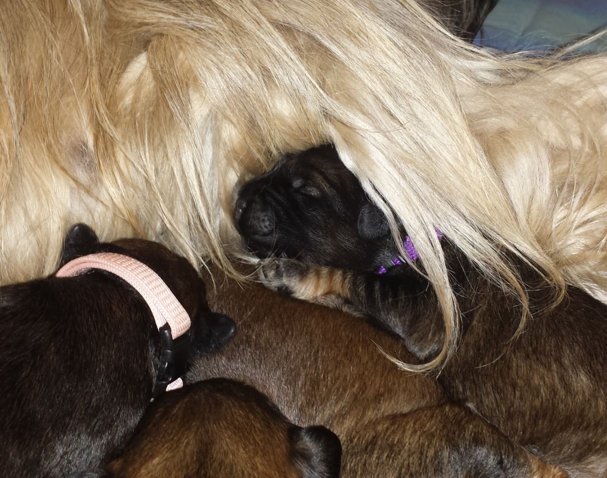 Im Rückblick habe ich noch einmal meine HP – Zusammenfassungen vom letzten Wurf durchgelesen, in wacher Erinnerung und ich dachte mir dabei : Ja, genauso ist es auch dieses Mal, meine Beschreibungen : Gedrängel an der Milchbar, die Pendelbewegungen des Kopfes, um Mama, die Geschwister und die Milchquelle zu finden, die schaukelnde Gangart des „Wackeldackels „, die Stimulierung des Ausscheidungsreflexes durch die Mutter, der spannende Moment des täglichen Wiegens, das Anlegen der Halsbändchen, Namensentscheidungen…. genau wie beim letzten Wurf !