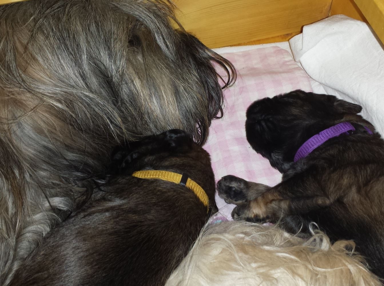 Aber wie beim 1. Mal hat Nana uns erst gemütlich frühstücken lassen, alles ruhig und gelassen, sogar mit morgendlichem Sonnenschein durch Fenster und erst dann waren Martin und ich gefragt in der Wurfkiste. 9.45 Uhr kam Nanas erstes Mädchen zur Welt und 14.45 Uhr ihr letztes Baby: insgesamt 4 Mädels und 3 Buben, alle gleich munter und hungrig.