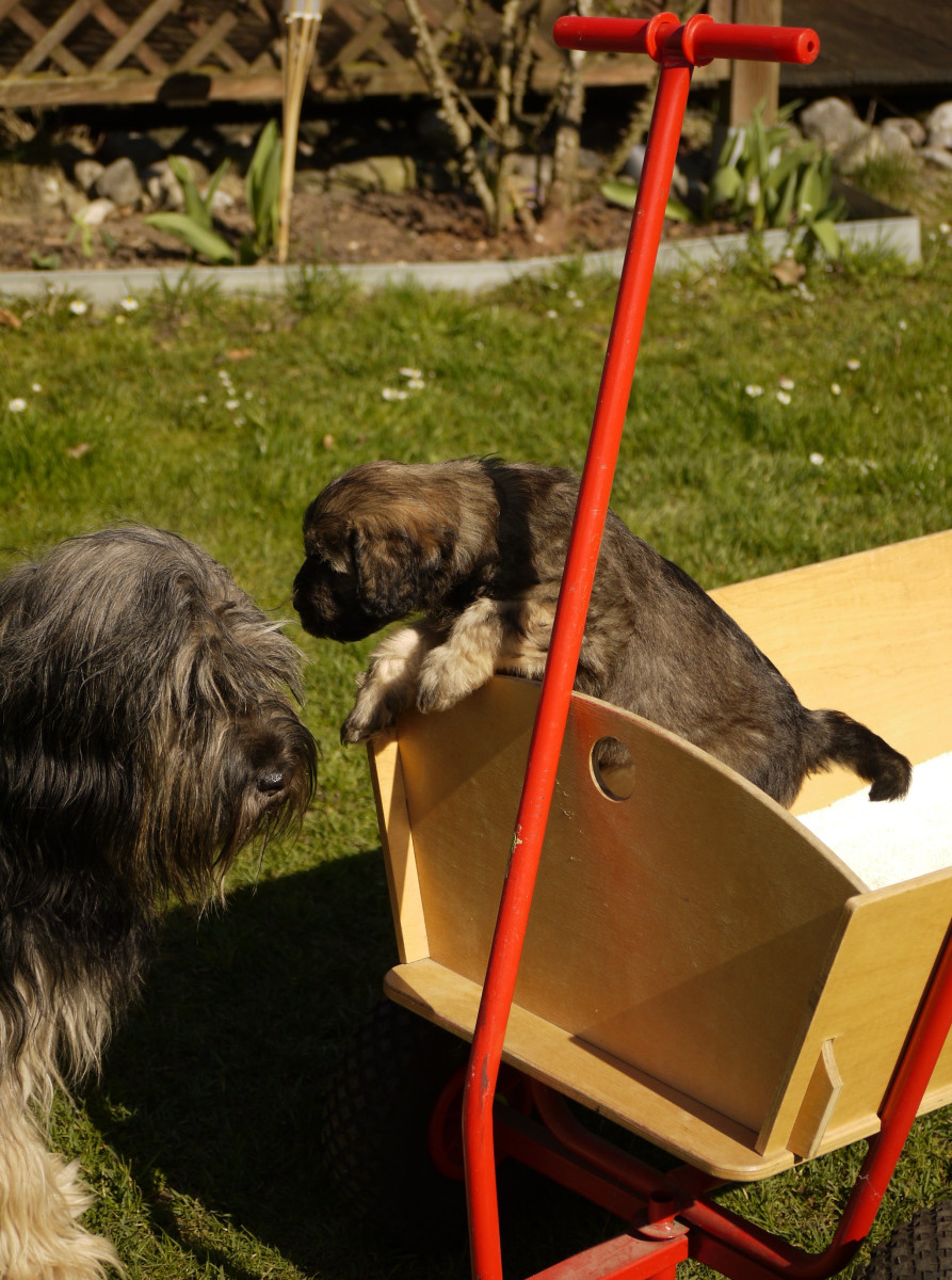 Staubsauger und andere Haushaltsgeräte, Musik, Geräusche von Motorsäge, Kinderspiel, Gesang haben sie in passender Dosis kennengelernt, verschiedene Besucher kommen kurz zwischendurch und jetzt wartet der Garten für erste Erkundungsausflüge.